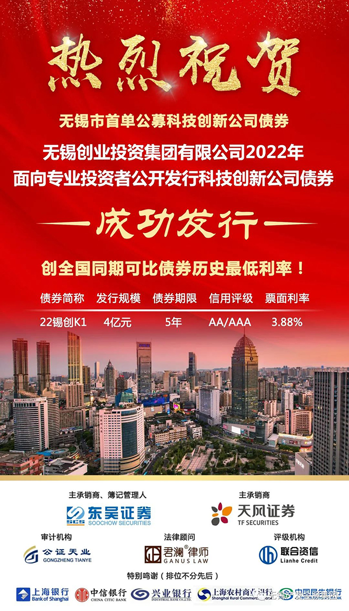 無錫創(chuàng)投集團(tuán)成功發(fā)行無錫市首單公募科技創(chuàng)新公司債券 |