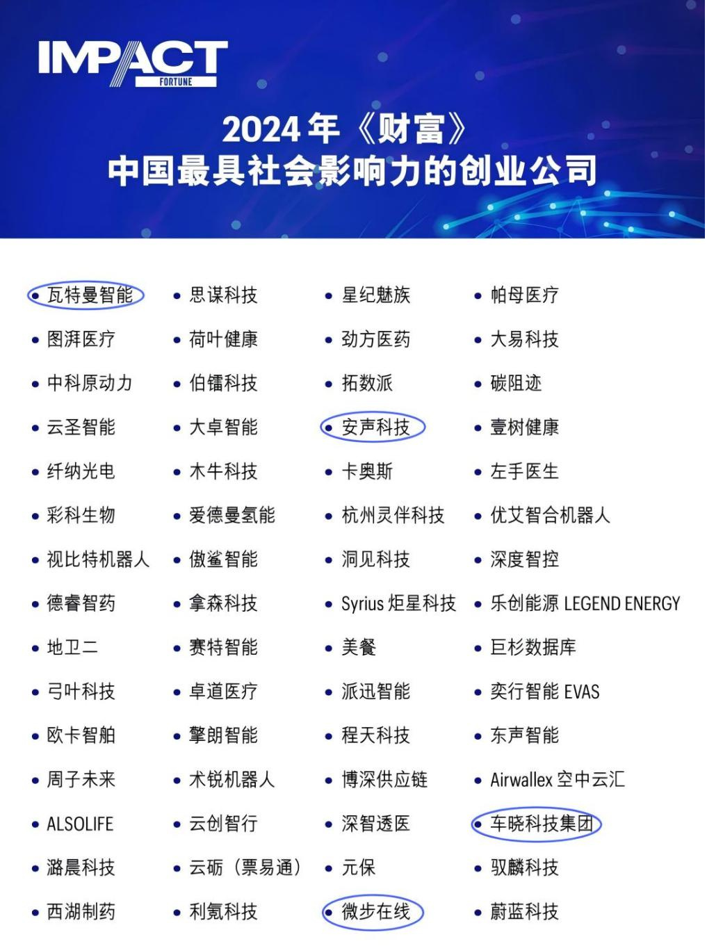 近日,全球著名商業(yè)雜志《財富》(Fortune Magazine)發(fā)布“2024年中國最具社會影響力的創(chuàng)業(yè)公司”榜單。創(chuàng)投集團(tuán)4家被投企業(yè)成功上榜,包括:瓦特曼智能、安聲科技、微步在線和車曉科技。 (一)北京瓦特曼智能科技有限公司